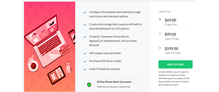 The single site license costs $69, which includes one year of plugin updates and customer support. The plan is also backed with a 30-day money-back guarantee. It is one of the best WooCommerce Gift Card plugins available on WooCommerce plugins collection.