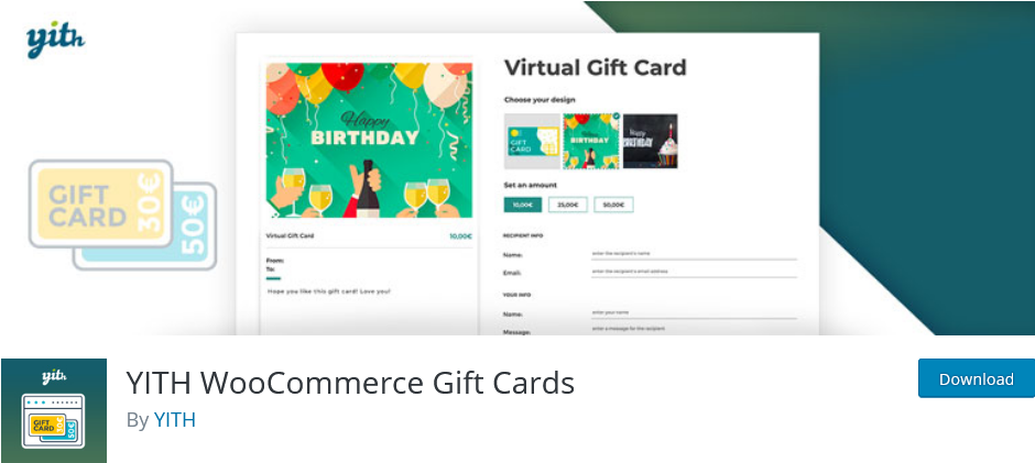 YITH WooCommerce Gift Cards is one of the most useful and widely used WooCommerce Gift Card plugins that leads you to create either digital or printable gift cards of any amount and let your clients the possibility and flexibility to personalize them to make a special gift for their loved ones. Besides that, YITH WooCommerce Gift Cards has been specifically designed for generating clients’ logos in a carousel on a website.